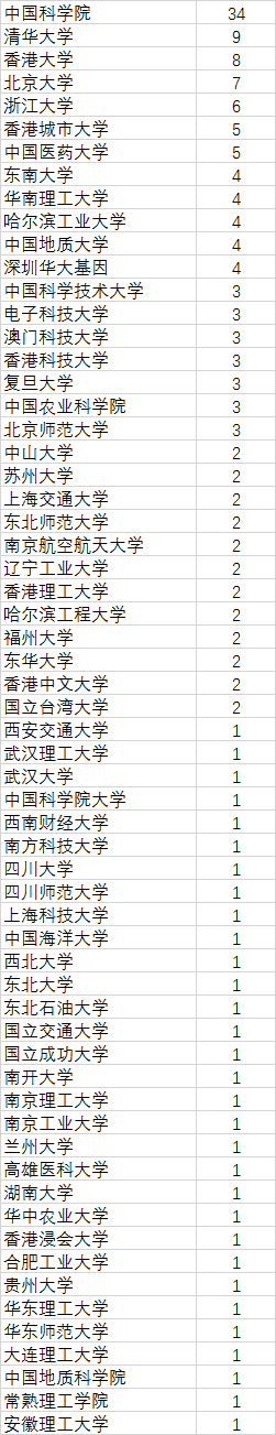 在183位中國學者中,共170人在中國地區工作,另13位學者第一單位在海外。其中,中國科學院所屬院所34人上榜,排名第一;清華大學9人,位列第二;香港大學8人,排名第三;北京大學7人,浙江大學6人,排在前五;香港城市大學和臺灣地區的中國醫藥大學各有5人,并列第六位。此外,東南大學、深圳華大基因、中國地質大學、哈爾濱工業大學、華南理工大學各有4人入選。中國科學技術大學、電子科技大學、澳門科技大學、香港科技大學、復旦大學、中國農業科學院、北京師范大學各有3人入選。中山大學、蘇州大學、上海交通大學、東北師范大學、南京航空航天大學、遼寧工業大學、香港理工大學、哈爾濱工程大學、福州大學、東華大學、香港中文大學、和臺灣大學各有2人入選。而常熟理工學院、安徽工業大學亦有學者入選。