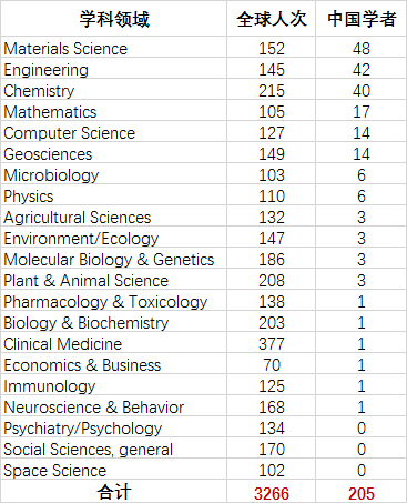 從整體而言,全球共有3083位學者入選高引作者榜單,其中135人同時入選2個學科,21人同時入選3個學科領域(包括中國的余家國和曹進德教授),更有2人同時入選4個學科領域。如果按照學科領域統計,則全球高引作者人次總數為3266。
