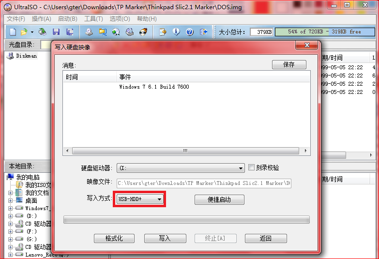 3.鐒跺悗鍦ㄥ脊鍑虹殑“鍐欏叆紜洏闀滃儚”紿楀彛涓仛濡備笅璁劇疆錛氱‖鐩橀┍鍔ㄥ櫒閫夋嫨浣犲垰鍒氭彃鍏ョ殑U鐩橈紝鍐欏叆鏂瑰紡閫夋嫨“USB-HDD+”銆?/span>