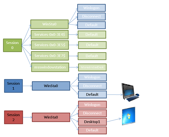 Window Stations可以理解為登陸后的不同用戶組,我們在任務管理器中可以看到不同的用戶名(比如 Richard, system, local service等),其中只有一個活動Station WinSta0, 只有這個Station是接受用戶鼠標鍵盤輸入的。而WinSta0 Station 又包括3個Desktop(包括Winlogon, Disconnect, Default), 其中Winlogon指的是登陸Desktop,當我們按Ctrl+Alt+Del時就會進入該Desktop;Disconnect指的是屏保Desktop; Default指的就是我們平時有任務欄的Desktop, 當然真正的Default Desktop是沒有應用程序的在上面的,我們看到的桌面其實是啟動Shell Explorer后的界面。